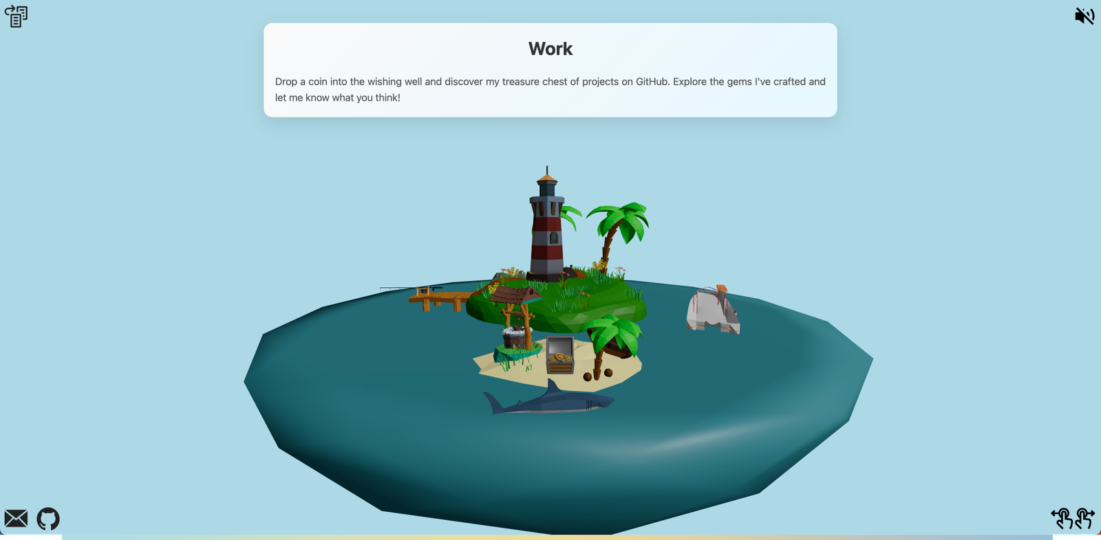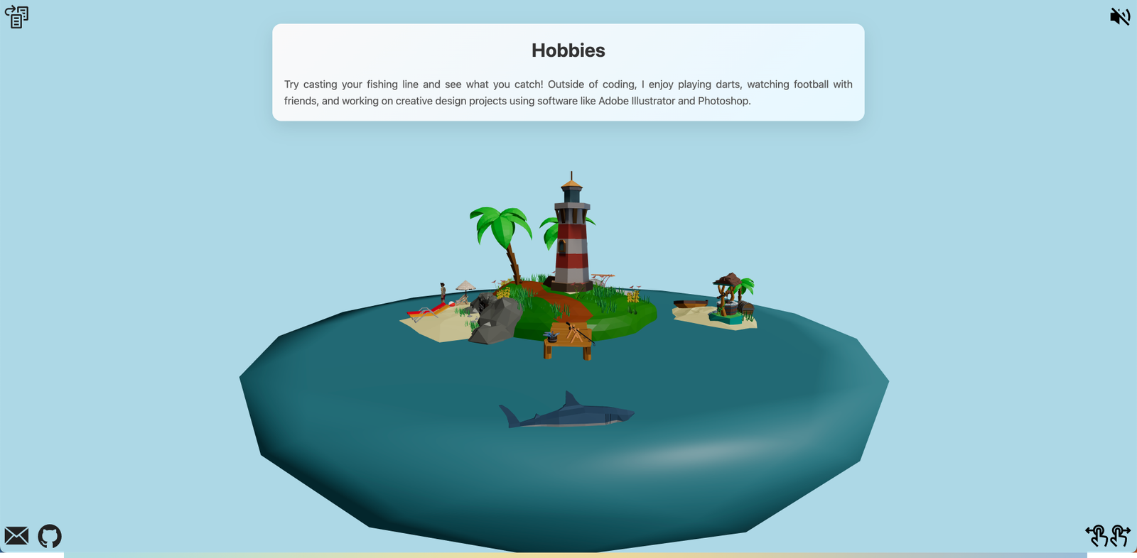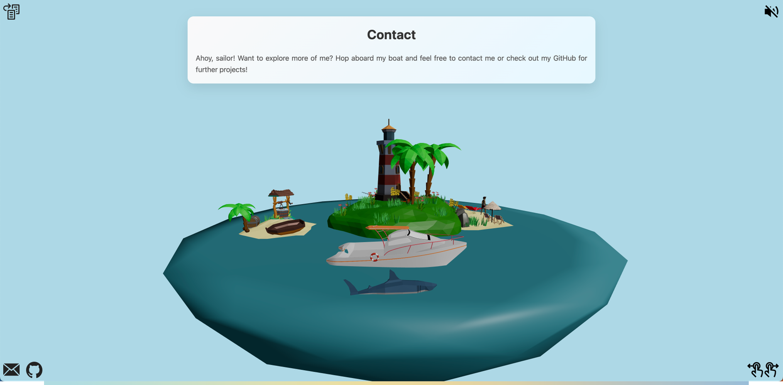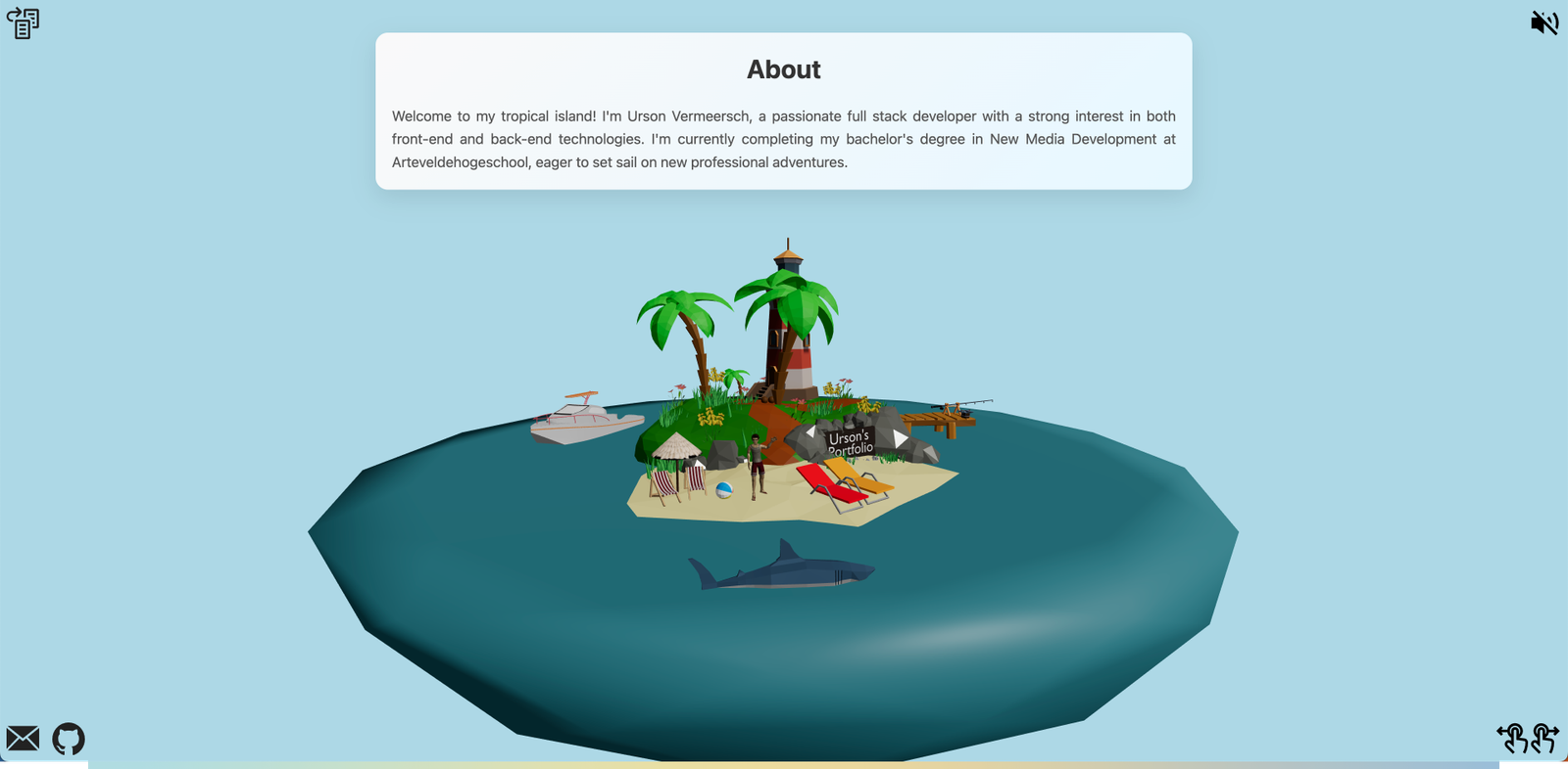 Mijn doel was om een omgeving te creëren die niet alleen visueel aantrekkelijk is, maar ook mijn technische en artistieke vaardigheden in 3D-modellering, animatie en interactieve webtechnologieën weerspiegelt. De haai is een dynamisch element die afhankelijk van de locatie van de gebruiker op het eiland, animaties en reacties activeert, zoals het weergeven van informatie over mijn projecten en vaardigheden.
